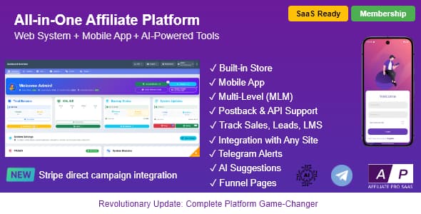 AffiliatePro SaaS-Affiliate-Vendor System-Mobile یک اسکریپت همکاری که بسیار پیشرفته و حرفه ای است. AffiliatePro SaaS یک راهکار جامع برای مدیریت برنامه های همکاری در فروش است. این سیستم به کاربران این امکان را می دهد تا به راحتی بازاریابان خود را مدیریت کنند، عملکرد آن ها را پیگیری کنند و کمیسیون ها را محاسبه کنند.