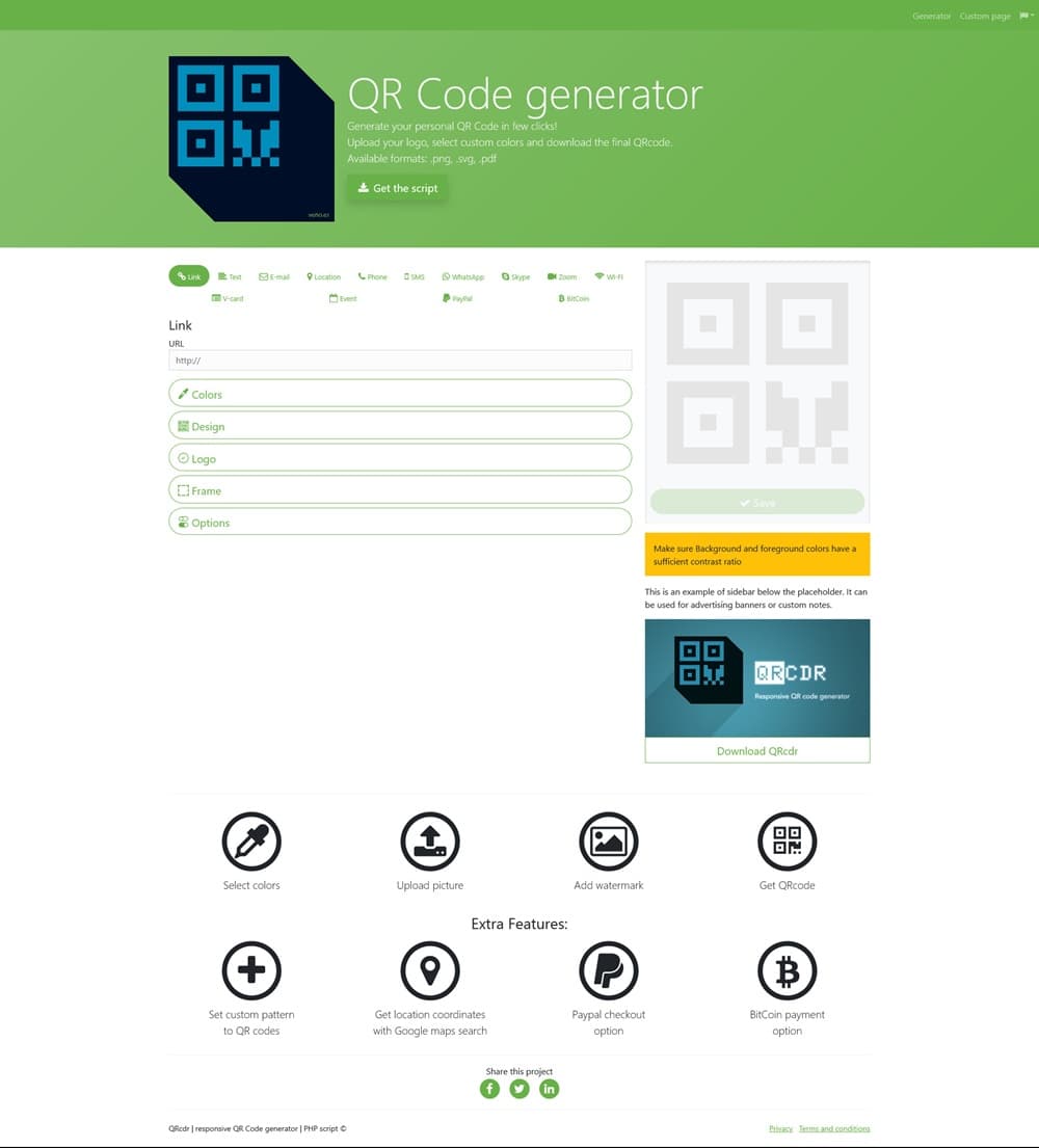 QRcdr-responsive QR Code generator یک اسکریپت ابزار که بسیار پیشرفته و حرفه ای است. QRCDR یک تولیدکننده QR کد کاربردی و واکنشگرا است که به کاربران این امکان را می دهد تا به راحتی و به سرعت بارکدهای QR سفارشی ایجاد کنند. این ابزار با طراحی کاربرپسند، قابلیت شخصی سازی کدها و لینک های مختلف را فراهم می کند.
