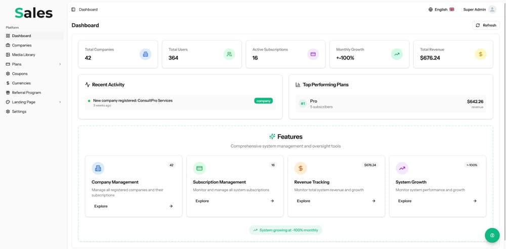 Sales SaaS-Business Sales CRM یک اسکریپت ارتباط با مشتری که بسیار پیشرفته و مدرن است. Salesy یک سیستم مدیریت ارتباط با مشتری (CRM) برای کسب و کارهای SaaS است که به بهبود فروش و مدیریت مشتریان کمک می کند. این ابزار امکانات متنوعی مانند: پیگیری فروش، تجزیه و تحلیل دیتا ها و مدیریت وظایف را ارائه می دهد.