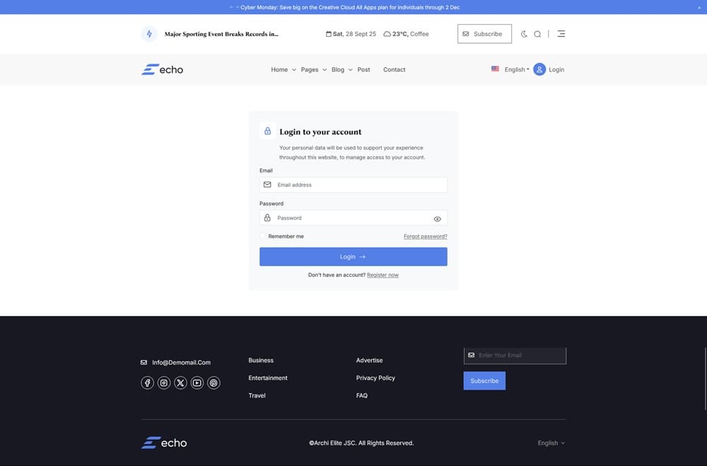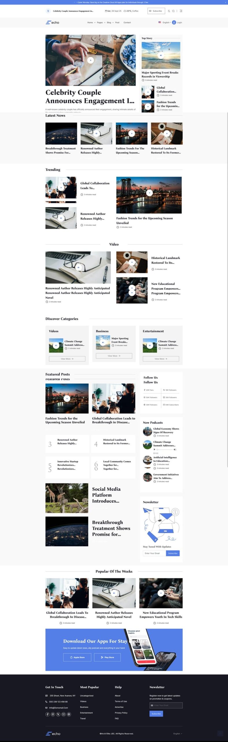 Echo-News-Magazine Laravel Platform یک اسکریپت خبری که بسیار پیشرفته و حرفه ای است. Echo یک پلتفرم خبری و مجله ای مبتنی بر Laravel است که به کاربران این امکان را می دهد تا محتوای خبری و مقالات را به راحتی مدیریت کنند. این اسکریپت دارای طراحی مدرن و واکنشگرا است که تجربه کاربری بهتری را فراهم می کند.
