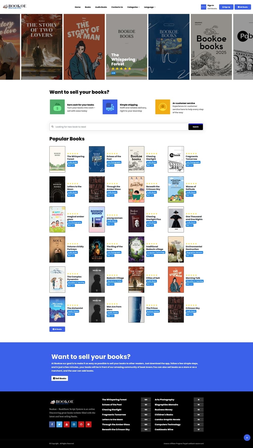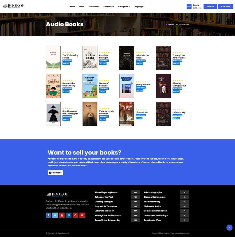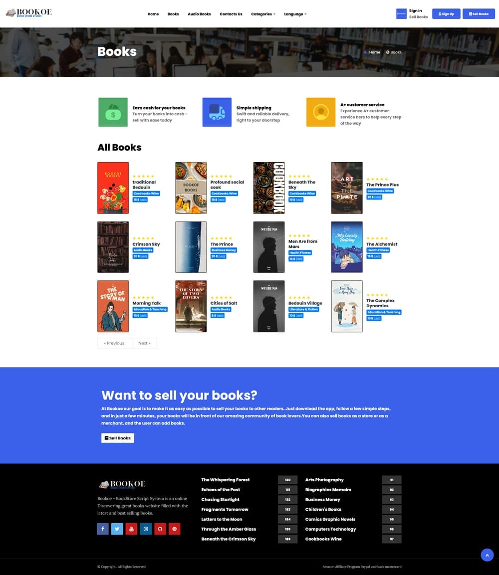 Bookoe-BookStore Script System with website یک اسکریپت فروشگاهی که بسیار پیشرفته و حرفه ای است. Bookoe یک پلتفرم جامع آنلاین است که برای ایجاد و مدیریت وبسایت های کتابفروشی طراحی کردند. این اسکریپت دارای طراحی مدرن و واکنشگرا است که به کاربران امکان می دهد کتاب ها را در دسته بندی های مختلف، از جمله پرفروشترین ها و کتاب های رایگان، جستجو و مرور کنند.