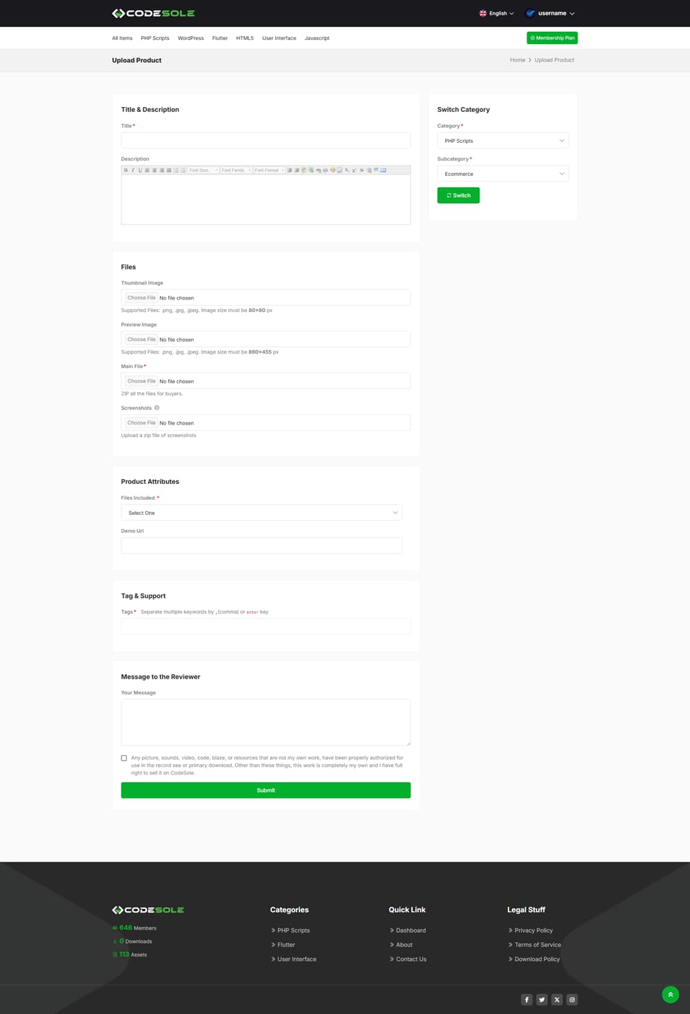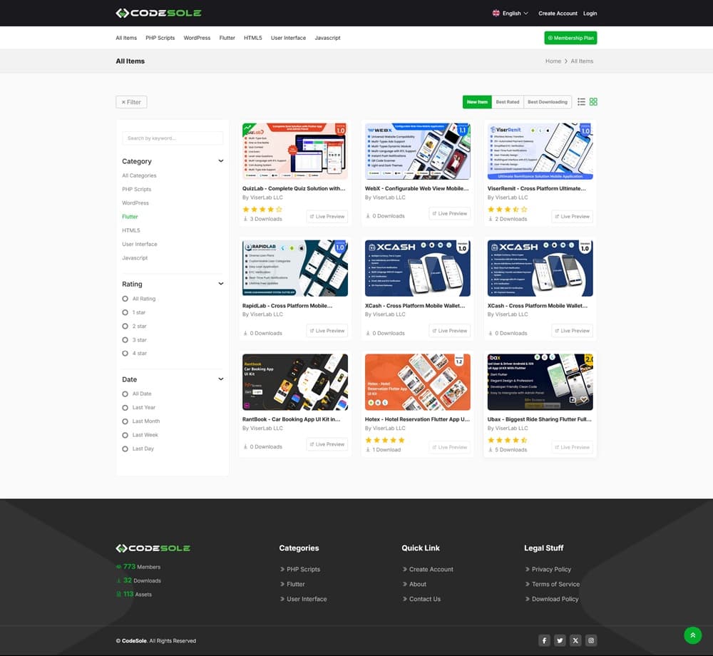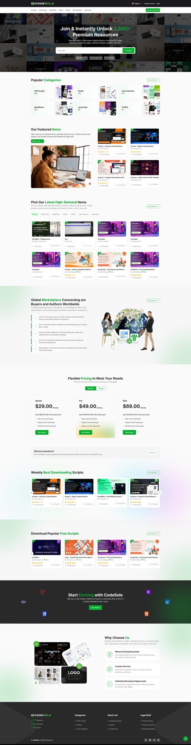 CodeSole-Code And Theme Marketplace یک اسکریپت مارکت پلیس که بسیار پیشرفته و حرفه ای است. CodeSole یک بازار آنلاین برای خرید و فروش کدها و تم های مختلف است، که به صورت اشتراکی عمل می کند. این پلتفرم به توسعه دهندگان این امکان را می دهد تا محصولات خود را به راحتی عرضه کنند و کاربران می توانند به راحتی به این محصولات دسترسی پیدا کنند.