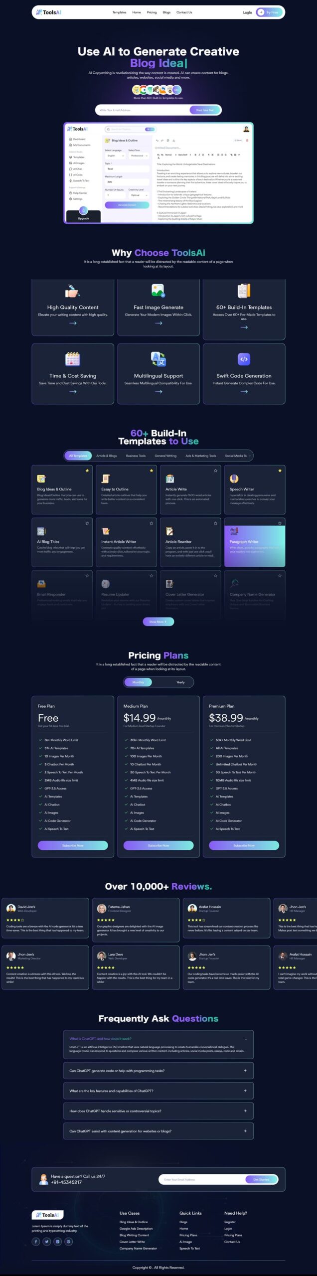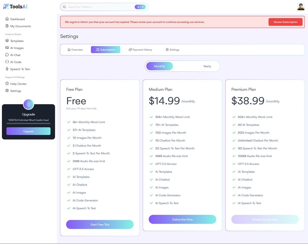 ToolsAi – Ai Content, Image, Chatbot, Code and Speech To Text Generator SAAS Platform