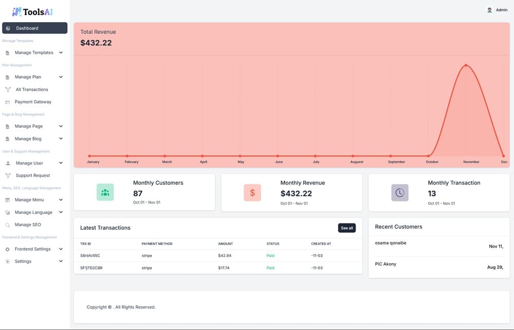ToolsAi-Ai Content-Image-SAAS Platform یک اسکریپت هوش مصنوعی که بسیار شیک و پیشرفته است. ToolsAi یک ابزار قدرتمند و منحصر به فرد برای تولید محتوا، تصاویر، کد و تبدیل گفتار به متن به کمک هوش مصنوعی است. این پلتفرم شامل الگوهای متنوع و امکان ایجاد الگوهای سفارشی با نیازهای خاص شماست.