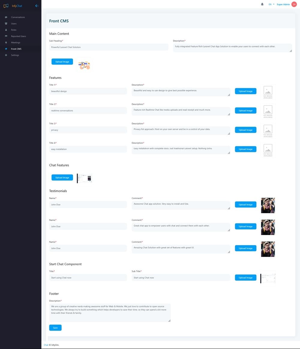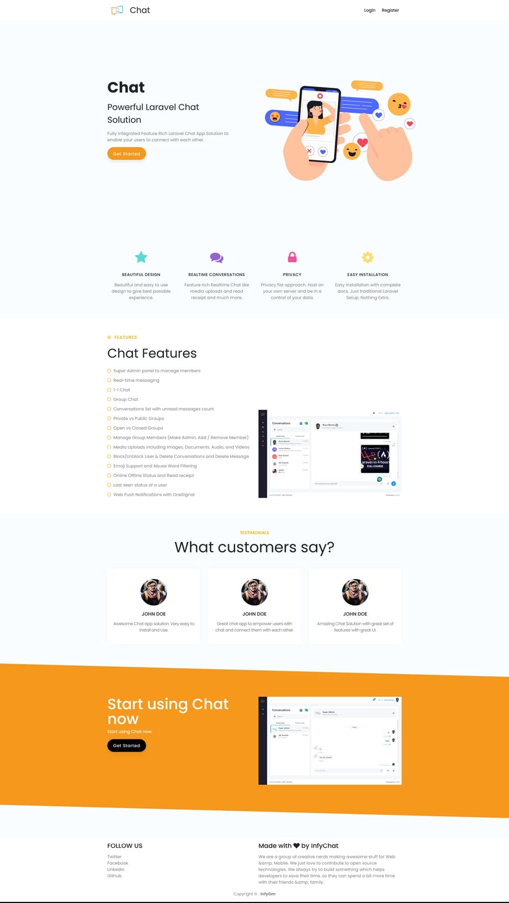 Chat-Laravel App-Private-Group-Real time Chat یک اسکریپت چت روم که بسیار شیک و پیشرفته است. InfyChat یک ابزار کاربردی برای پیاده سازی سیستم چت در Laravel است که به توسعه دهندگان این امکان را می دهد تا ویژگی های چت را به راحتی به پروژه های خود اضافه کنند.