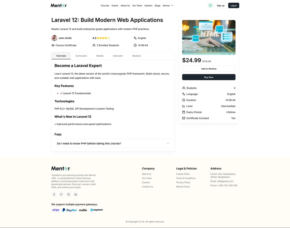 Mentor LMS-Learning Management System یک اسکریپت یادگیری که بسیار پیشرفته و حرفه ای است. Mentor LMS یک سیستم مدیریت یادگیری قدرتمند است که با Laravel و React طراحی کردند. این اسکریپت برای افرادی که می خواهند به سرعت یک پلتفرم آموزشی آنلاین راه اندازی کنند، گزینه ای ایده آل محسوب می شود.