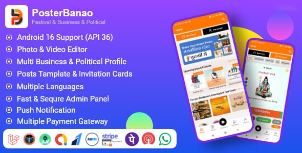 Poster Banao-Poster Maker-Festival-Political یک اپلیکیشن سازنده اندروید که بسیار پیشرفته و حرفه ای است. Poster Banao ابزاری قوی برای طراحی پوسترها و تبلیغات است که به ویژه برای رویدادها و کسب و کارها مناسب می باشد. این سورس اندروید را به صورت رایگان امتحان کنید.