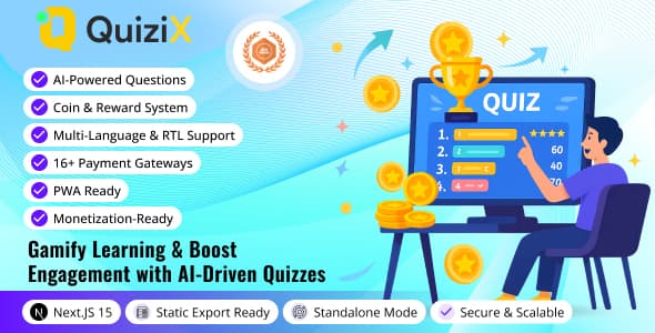 QuiziX-AI Quiz-Trivia Game-Laravel -Next.js یک اسکریپت بازی که بسیار پیشرفته و مدرن است. Quizix یک پلتفرم پیشرفته برای ایجاد و مدیریت آزمون های آنلاین است که با استفاده از Laravel و Next.js طراحی کردند. این ابزار به کاربران این امکان را می دهد که آزمون های تعاملی و جذابی ایجاد کنند و به صورت آنلاین به رقابت با دیگران بپردازند.