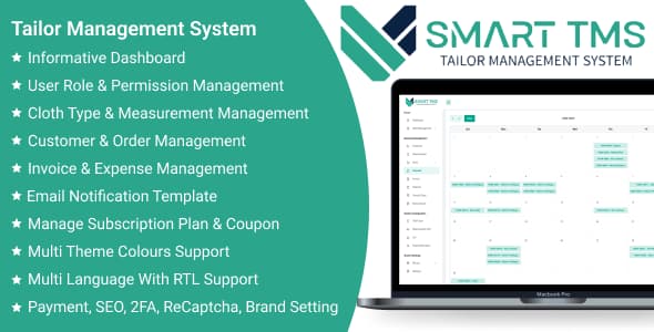 Smart TMS SaaS-Tailor Management System یک اسکریپت خدمات که بسیار پیشرفته و مدرن است. Smart TMS SaaS یک راهکار مدیریتی جامع برای مشتریان، سفارشات و فرآیندهای مربوط به خیاطی است. این سیستم امکان مدیریت آسان جزئیات مشتری، ثبت سفارشات و پیگیری وضعیت آن ها را فراهم می کند.